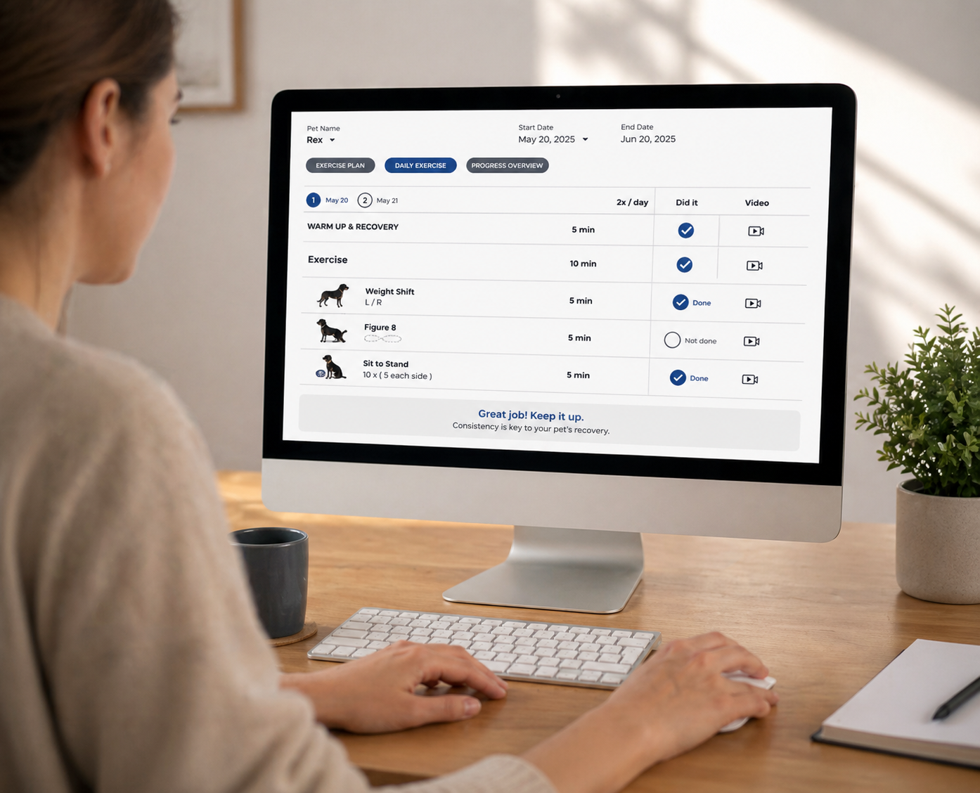 Track progress, reinforce consistency, and keep recovery on track at home